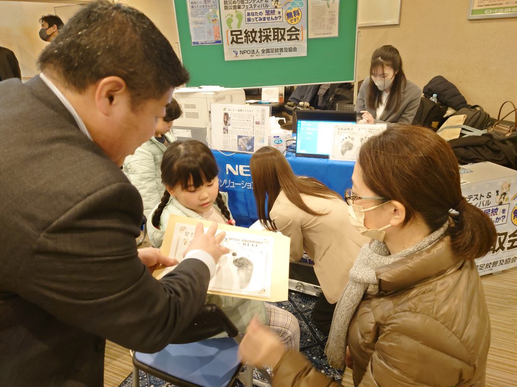 令和7年2月2日(日)、名古屋市中区役所において開催された「第4回防災ぬり絵コンテスト&防災音楽フェスティバル」〔主催:NPO法人防災自助普及委員会、共催:名古屋市など〕に出展して“足紋採取会”を実施しました。