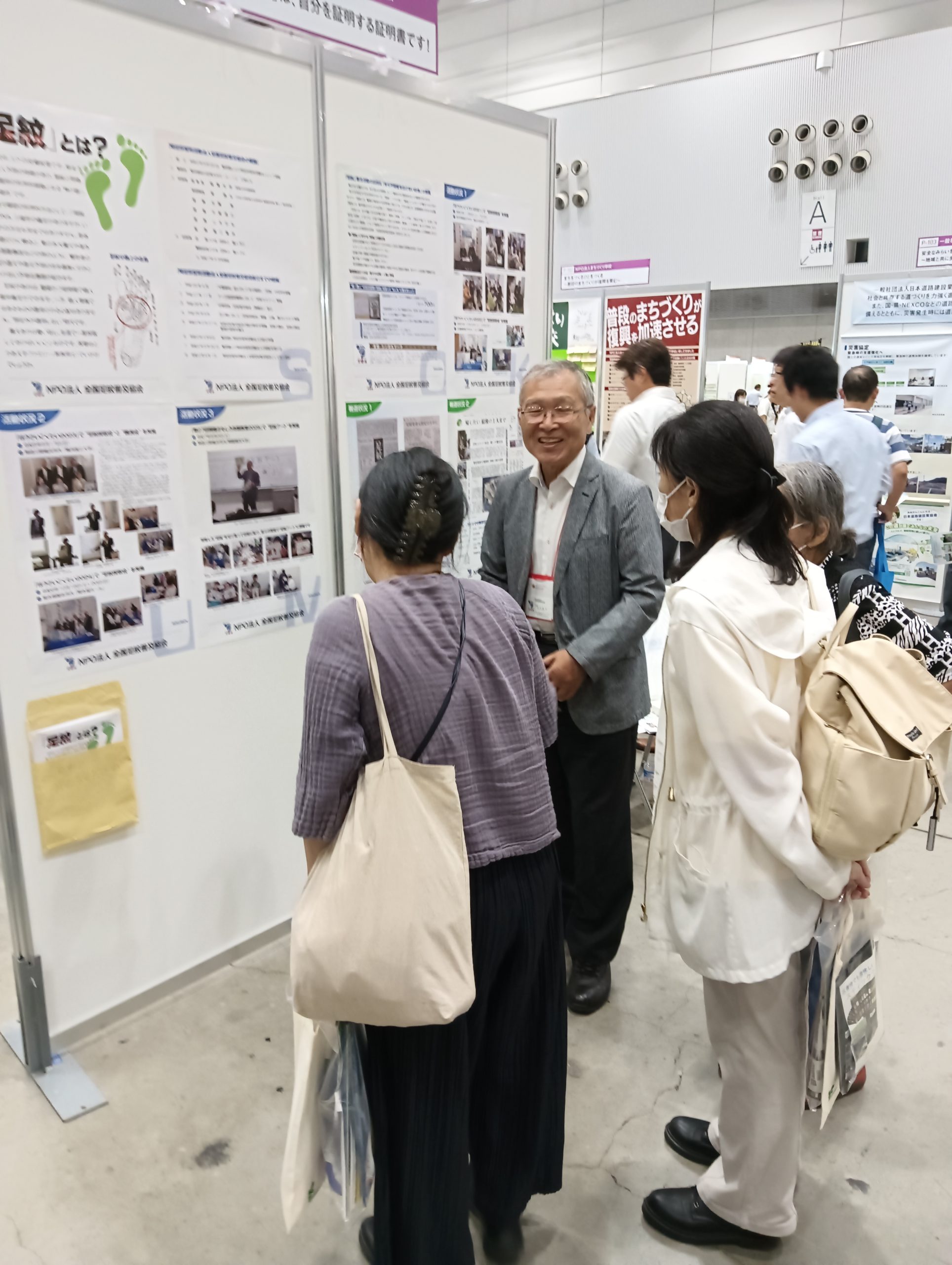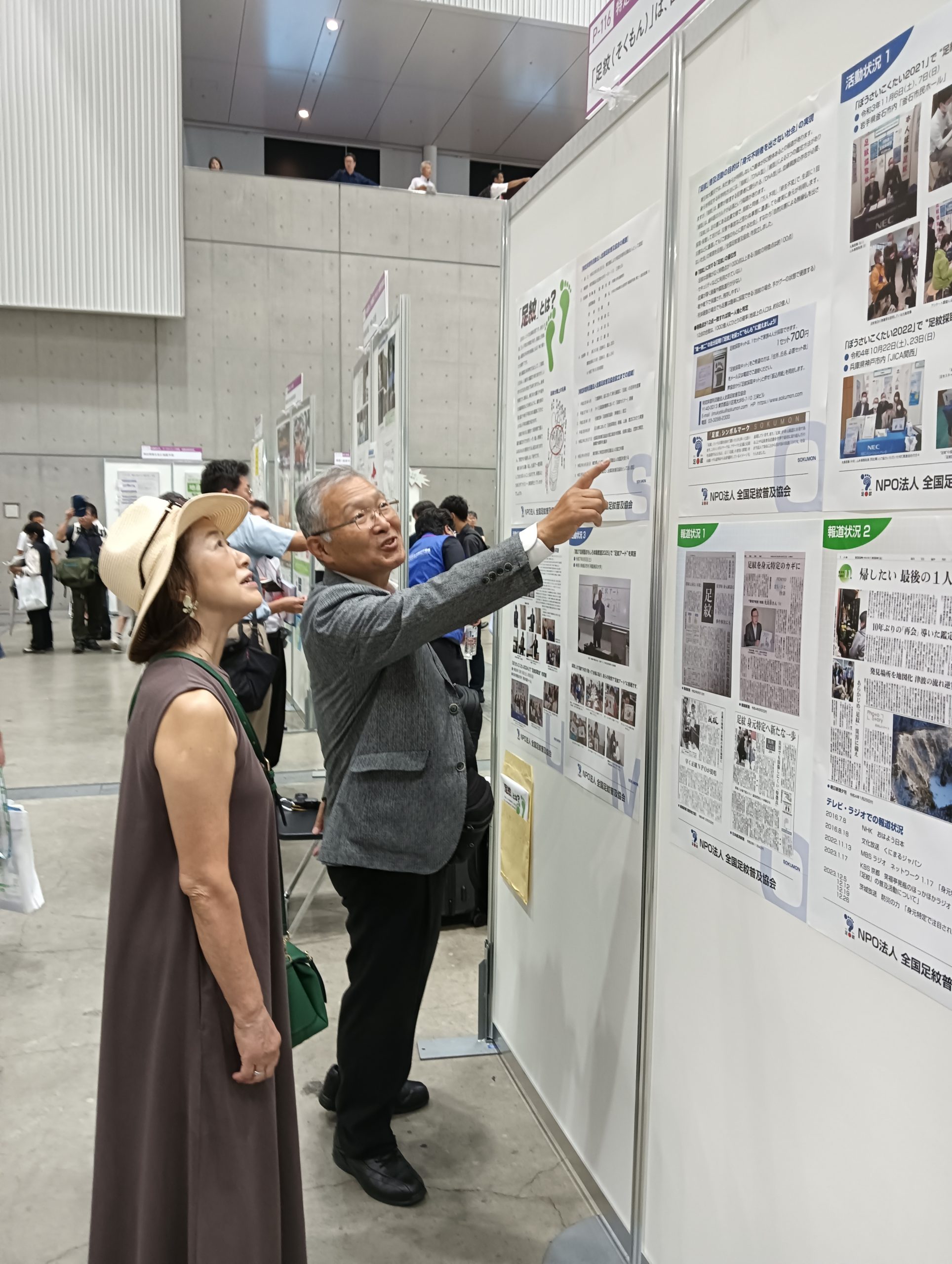 今回の出展は足紋採取会なしの「パネル展示」でしたが、会場を訪れた議員や自治体職員、報道関係者、防災団体関係者をはじめ、参観の家族連れなどに対し、パネルによる説明と併せてチラシを配布して大勢の方々に“足紋”を知っていただきました。